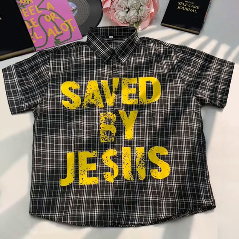 Plaid lapel saved by jesus shirt